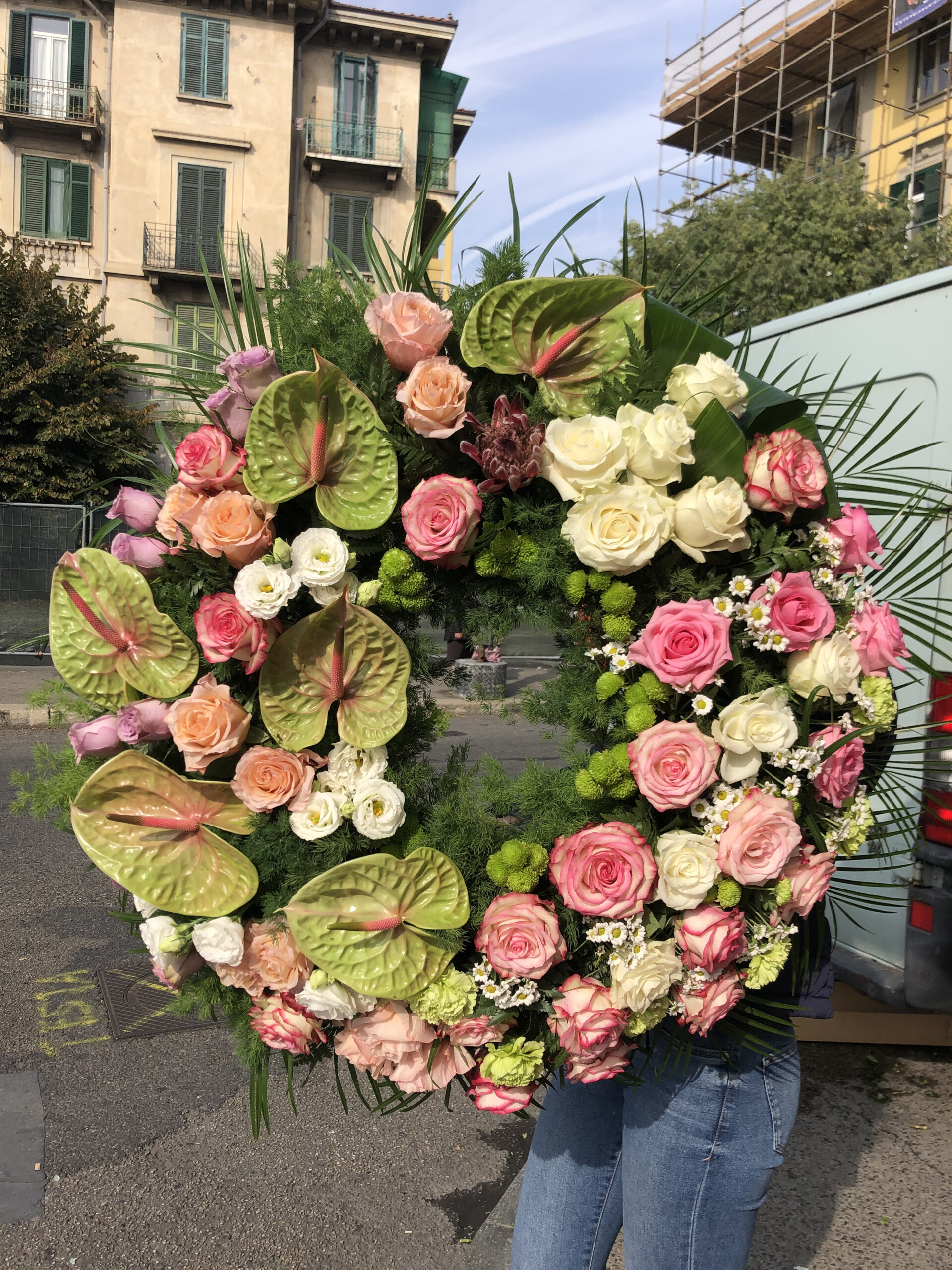 corona funebre realizzata con fiori misti di stagione diametro 70 cm.